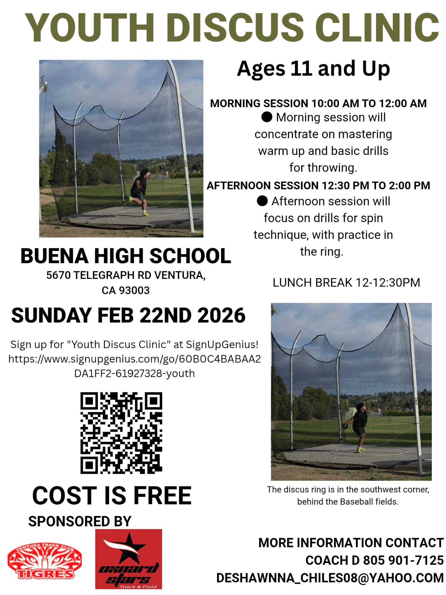Monday, February 2 at 5:30 pm — First day of 10U (Bantams), 12U (Juniors), and the Youth/Intermediate teams will begin at the Buena High School Track.